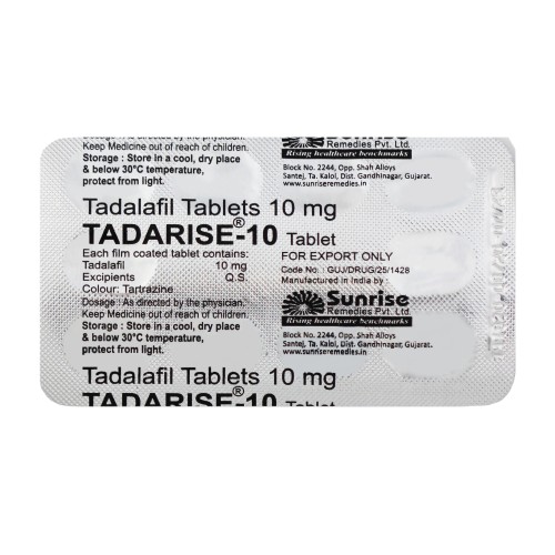 TADARISE-10 (Tadalafil 10 mg / Generic Cialis) contains the active substance Tadalafil, which is originally manufactured by Cialis at Eli Lilly. Tadalafil is used to treat erectile dysfunction and impotence. These forms of Tadalafil are manufactured by the Indian pharmaceutical company Sunrise Remedies Pvt.Ltd. and it gives exactly the same effect as Cialis at a much lower price.