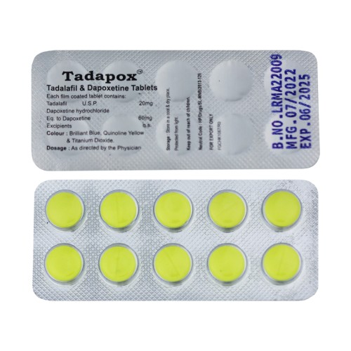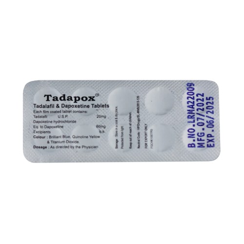 TADAPOX - Tadalafil 20mg ( Cialis) & Dapoxetine 60mg ( Priligy) - is manufactured and marketed by RSM Enterprises PTV Ltd. (India). This is a new combination tablet containing two of the most potent and effective pharmaceuticals proven to combat combat both the major causes of male sexual dysfunction.Tadapox tablets contain 20mg Tadalafil and 60mg Dapoxetine. For best results take 1 tablet 1-3 hours before sexual activity. Take only when needed and do not take more than one tablet per day. Tadapox is a combination of two medicines (Tadalafil and Dapoxetine) quite popular in the market and among the patients from all over the world who are suffering from erectile dysfunction and other symptoms of impotency. Tadapox is a powerful drug that helps men deal with impotency and premature ejaculation. Tadapox also known as, Tadalafil with Dapoxetine, is the first of its kind treatment that has helped men gain the most from their sexual activity.Tadalafil is in a class of medications called phosphodiesterase (PDE) inhibitors. It is known to help men deal with decreased supply of blood to the male reproductive organ by making it stiff and hard so that the man can have intercourse.Dapoxetine belongs to a group of medicines called “selective serotonin reuptake inhibitors” (SSRIs), used to treat premature ejaculation (PE) in men between 18 and 64 years old. It allows men to have a longer time in the act by delaying their action. Rapid ejaculation is also a common problem in men of certain age group and this tablet called the Tadapox is generally beneficial for the treatment of these small but significant problems in the love life of men from all ethnicities. Dapoxetine HCL is the uniquely first medicine to treat premature ejaculation between 18-64 years old men. Tadapox is available in the market in form of a tablet to be taken by mouth with a glass of plain water on empty stomach or after sometime of having food as per the instructions mentioned in the prescription. The common side effects of this drug can be diarrhea, nausea, dizziness, drowsiness, stomach problems and headache. However, these side effects will no longer persist in case you follow the prescription and the advice of the doctor on regular basis.