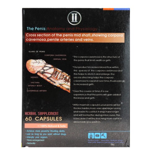 Yes,We tell you it really useful.Penis like a startling natural hydraulic machinery, erection and physiological responses subsided, the performance of an organ in a certain capacity for the next showing of the inflow and outflow of blood dynamics.According to the size of the penis, There will be approximately 80-200 ml increase in blood volume when you erect than usual. When the male sexual arousal, the brain or spinal nerve convey the message of erection, the "transmission factor erectile" effect to the penis cavity sponge, causing the arteries dilate blood pressure, about two per one hundred milliliters of blood into the penis cavity sponge, the further pressure to the vein, resulting in difficulties in the blood return to a sustained erection.Penis erection cavity filled with blood from the three sponge composed of three cavernous cavity exercised the function of penile erectile tissue, while the corpus spongiosum penis head and provide for the erection size, penis as a pair of provides a hardness of erection.Blood filled cavity in the penile corpus cavernosum erectile tissue, swollen after absorbing water like a sponge the same principle.Intracavernous penile cavity can accommodate blood volume determines the size of an erection. Therefore, Maxman Capsules II cavernous blood by increasing the capacity of the cavity, you can achieve increased penis size. Usage: One capsule at a time; maximum six a day; please swallow the capsules without chawing or breaking them.